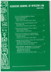 Articles: - Time Limit in Election Petitions in Nigeria: problems and Prospects Iyabode Ogunniran - A Discourse on the Yoruba Philosophy of Law Akin Ibidapo-Obe - Culture and the Definition of Crime in Nigeria Obiora Atuegwu Egwuatu - Succession at Customary Law: Addressing the Crossroads of Constitutional Conflicts in Nigeria Oluwakemi Adekile - Language, Sex and Gender in Africa: The Yoruba Example Adetokunbo Wande-Abimbola Book Review - Afe Babalola: The Living Legend (Volume I & II), Barristers Ayo Olanrewaju; and Basi Biobaku-Fawehinmi Reviewer: Akin Ibidapo-Obe