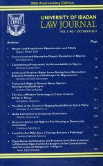Articles: ? Mergers and Acquisitions: Opportunities and Pitfalls ? Court-Connected Alternative Dispute Resolution in Nigeria ? Constitutional Framework for Accountability in Nigeria ? Intellectual Property Rights Issues Arising from Biomedical Research: Problems and Challenges for Nigerian Law ? Trademark Right in Domain Name System: A jurisprudential Analysis ? The Use of Modern Technology in Crime Control: A Plus or Minus ? The Role of the Courts i Shaping South African Social Policy ? Audit Committee in Corporate Governance ? Access to Justice and Right To Fair Hearing as Democratic ? Land Use Act: Why Does a Therapy Become a Pathology? ? Equal Access to Education and Freedom from Discrimination in Education Opportunity: An Analysis of the constitutional and International Obligations in Nigeria